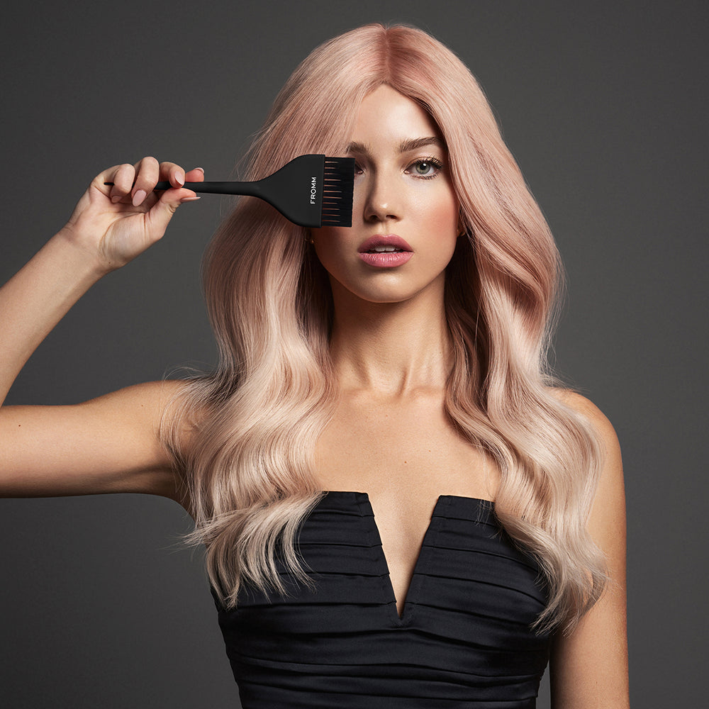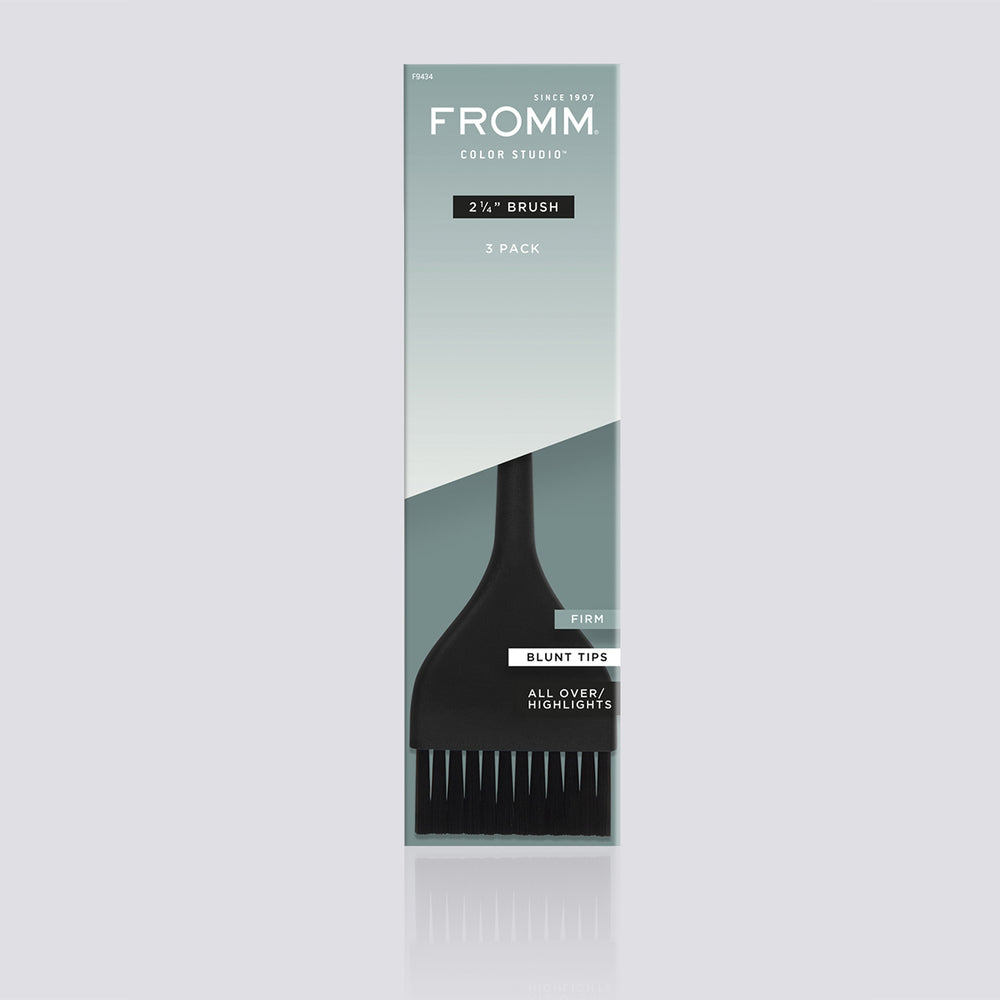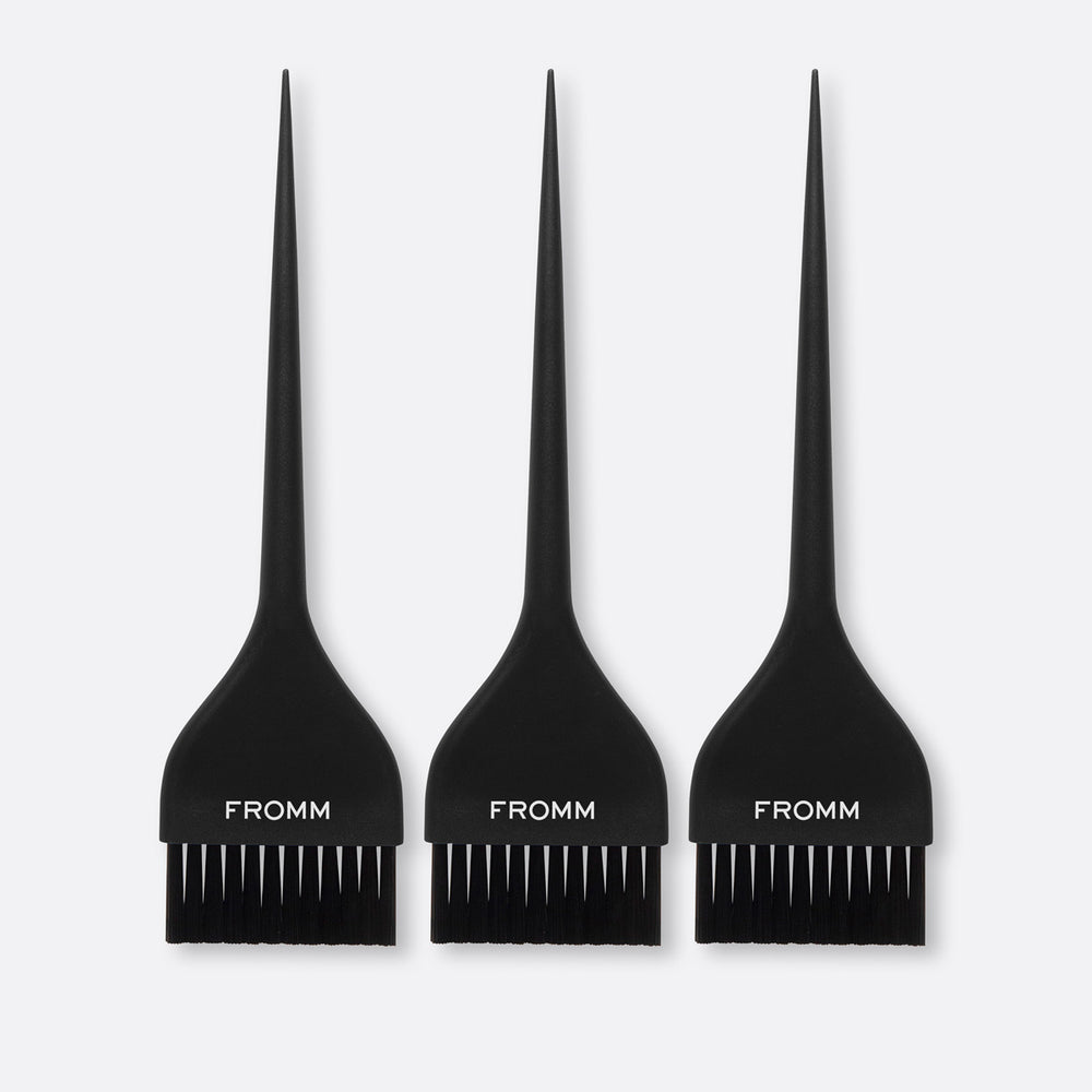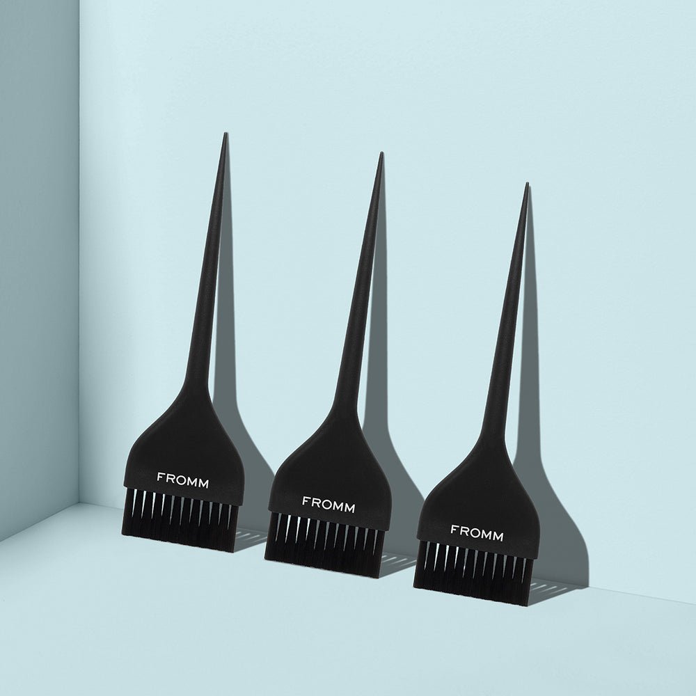 Firm wide color brushes for classic techniques including all over color, highlights and root touch ups. Set of three professional color brushes with a stainproof noir black matte finish.