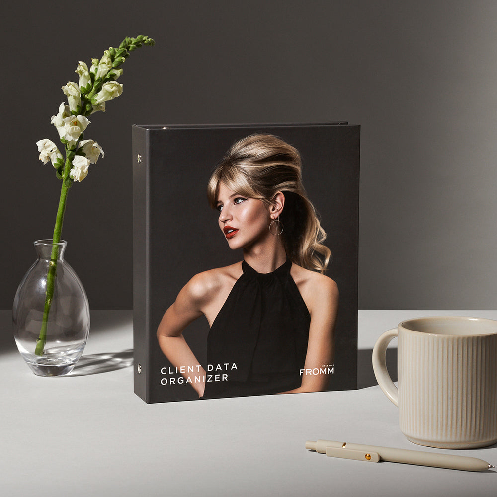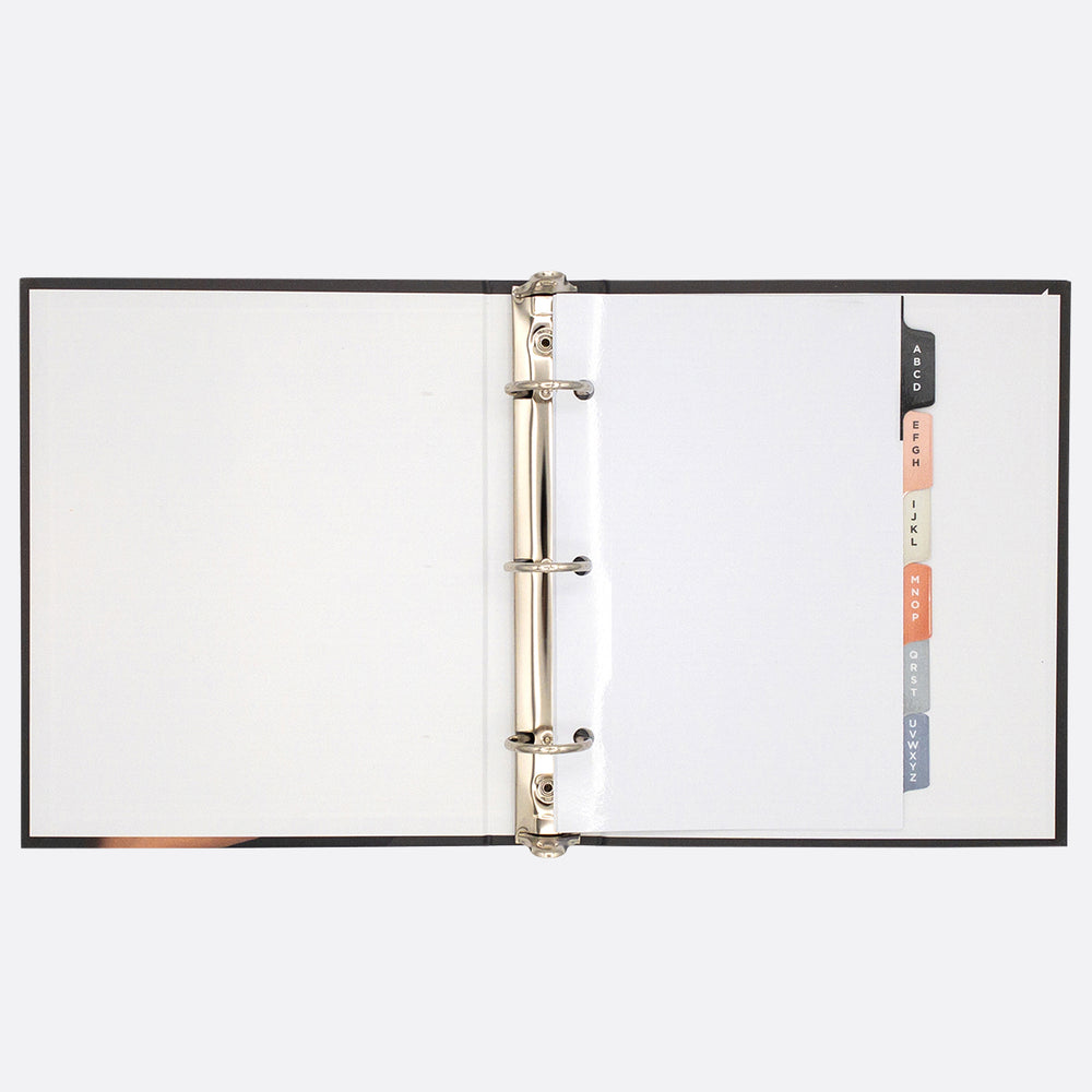 3 ring binder designed to hold client information cards that includes alphabetized tabs for easy organization.