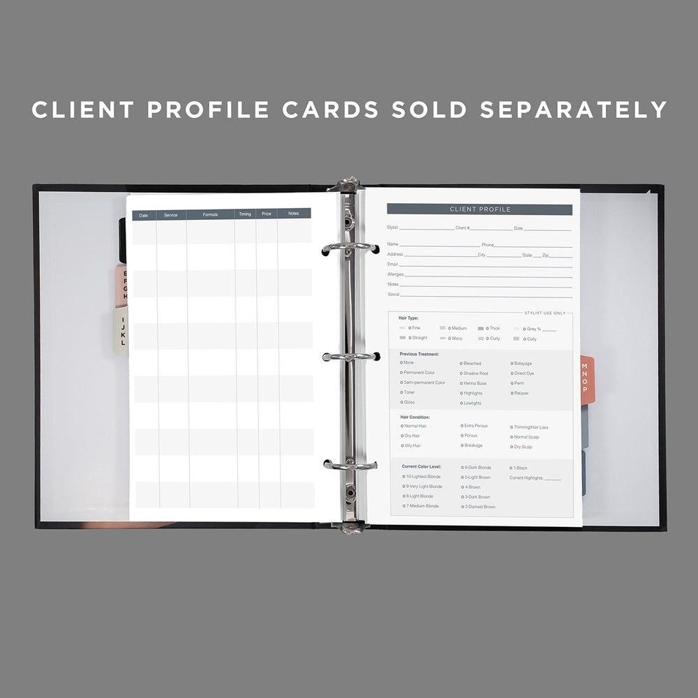 3 ring binder designed to hold client information cards that includes alphabetized tabs for easy organization.