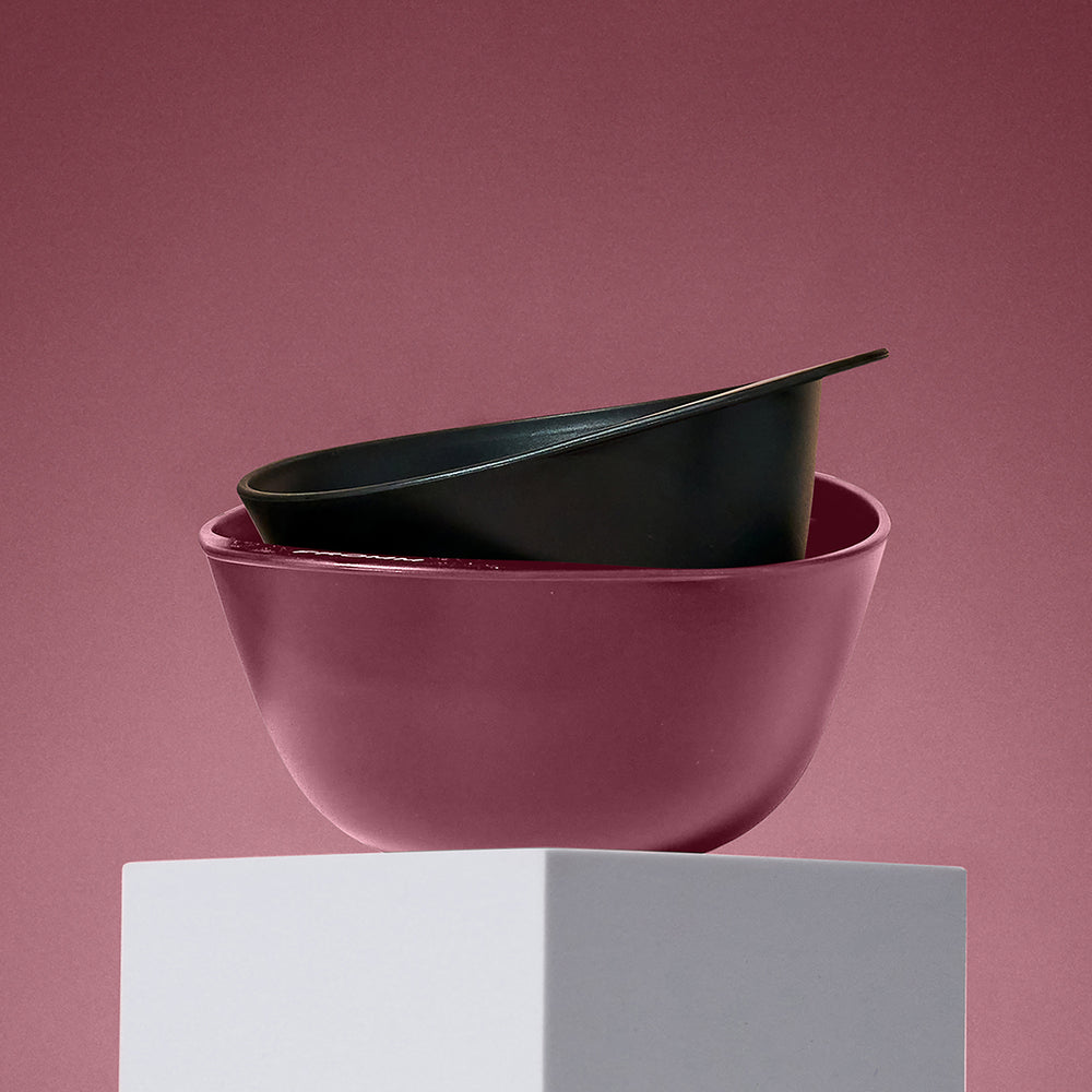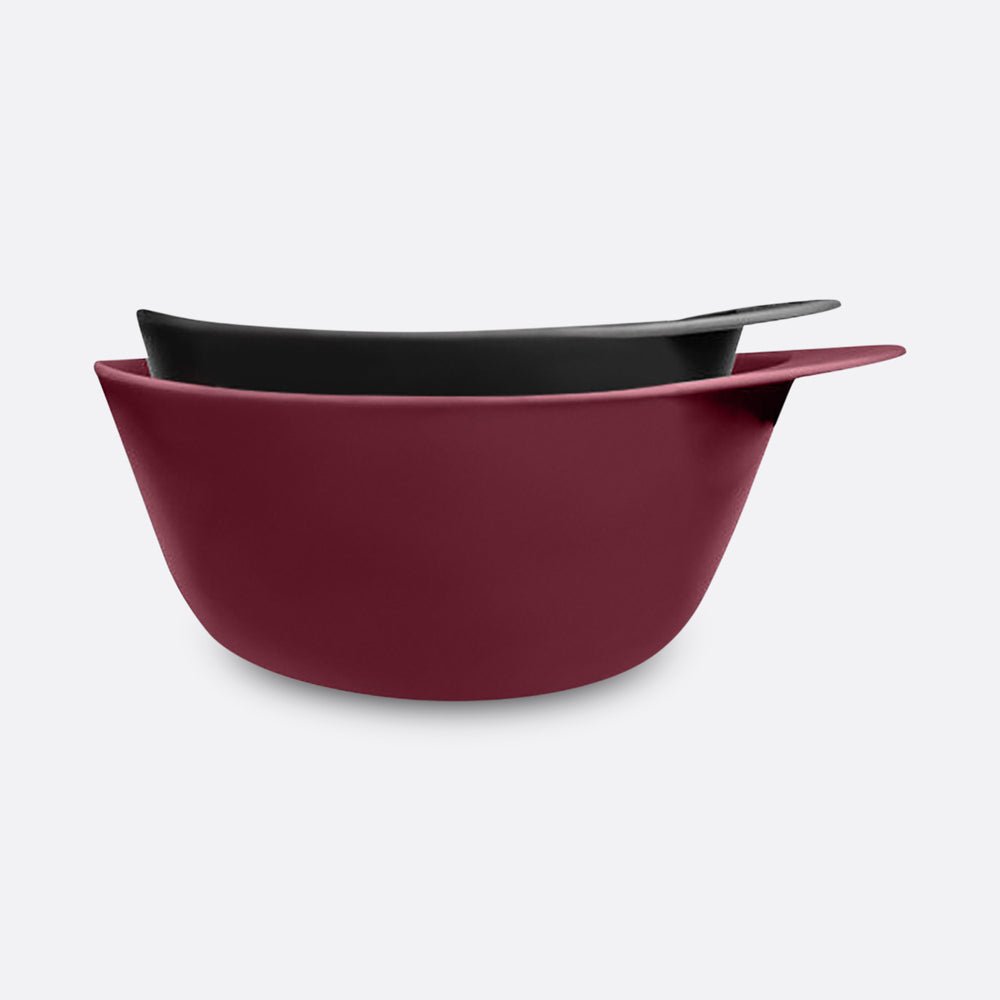 Set of 1 small black 10oz and 1 large burgundy 16oz bowl with a stainproof matte finish.