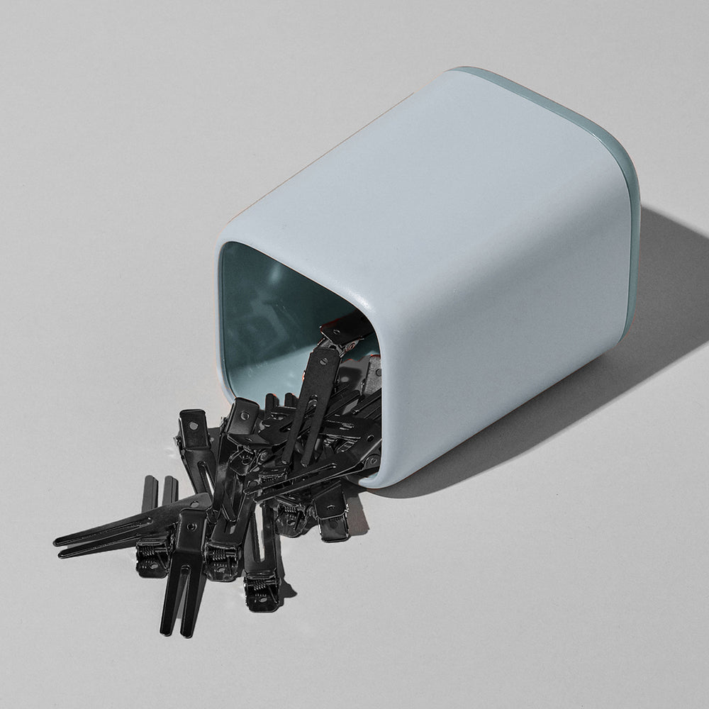 Double prong clips for pin curls, securing rollers in place, adding lift at the roots, holding hair in place while styling, blow drying, cutting or makeup application.
