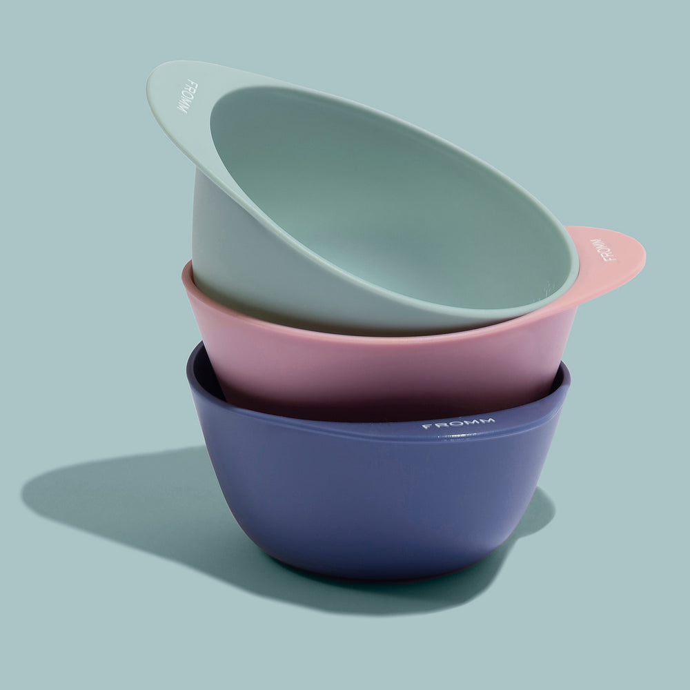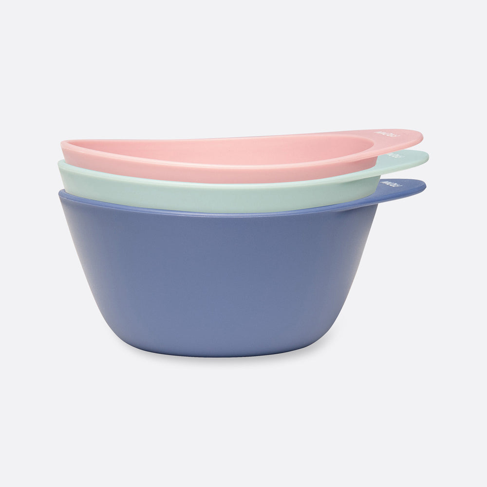 Set of 3 small size mixing bowls for multi color mixing with a stainproof matte finish.