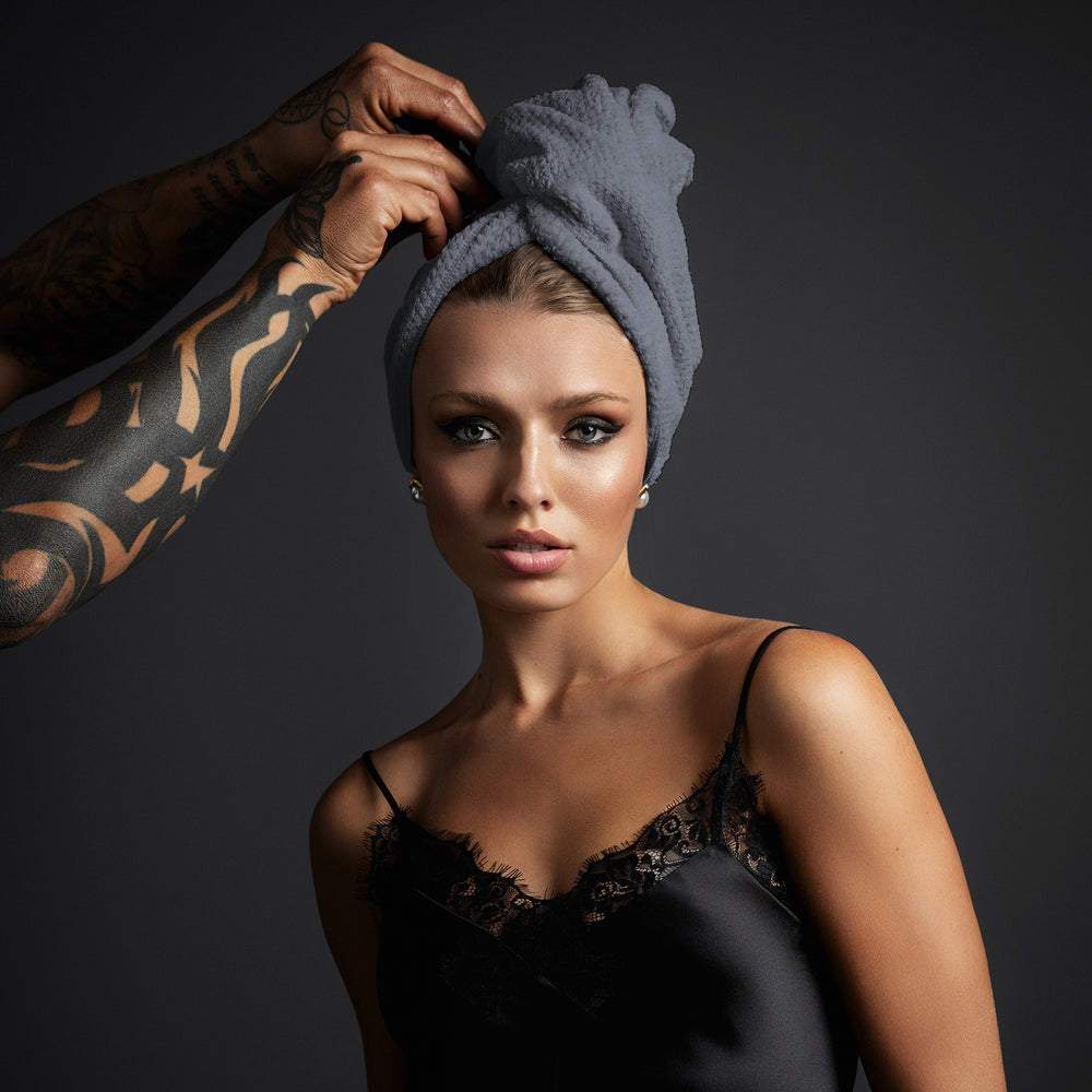 Ultra absorbent microfiber dries hair faster, reducing damage. Super plush, friction-free material is gentle and non-abrasive on fragile wet hair and skin. Part of the Studio Experience™ collection.